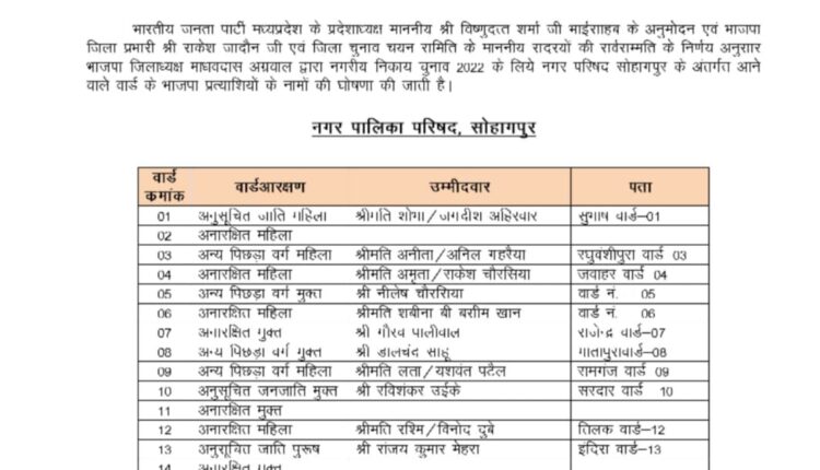 बता दे कि नगरीय निकाय चुनाव में भाजपा ने क्षेत्रीय विधायको को निकाय चुनाव जीतने की जिम्मेदारी दी है साथ ही क्षेत्रीय विधायको ही पार्षद पदों के उम्मीदवारों की टिकिट फायनल करने की जबावदेही पार्टी द्वारा दी गई थी जिस पर अंतिम मोहर जिला अध्यक्ष की लगाई जाना थी। जिसके चलते गुरुवार को सोहागपुर नगर परिषद चुनाव को लेकर भाजपा द्वारा 11 वार्डो के उम्मीदवारों के नाम घोषित कर दिए है जिनमे सुभाष वार्ड से शोभा जगदीश अहिरवार, रघुवंशीपुरा से अनीता अनिल गैहरिया , जवाहर वार्ड से अमृता राकेश चौरसिया , गांधी वार्ड से नीलेश उर्फ डीलेश चौरसिया, मातापुरा वार्ड से एकदम नया नाम डालचंद साहू घोषित किया गया है, वही किलापुरा वार्ड से शबीना बसीम खान , तिलक वार्ड से रश्मि विनोद दुबे , रामगंज वार्ड से लता यशवंत पटेल, सरदार वार्ड से रविशंकर उइके, इंदिरा वार्ड से संजय मेहरा, राजेंद्र वार्ड से गौरव पालीवाल को उम्मीदवार घोषित किया है।