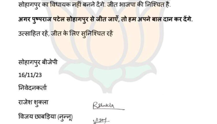 मतदान के बाद अब एक पत्र के वायरल होने से बवाल मच गया है। यहां के सोशल मीडिया ग्रुपो भाजपा 7 नेताओं के नाम लिखा एक पत्र वायरल हो रहा है जिसमें कांग्रेस प्रत्याशी पुष्पराज पटेल को गुंडा कहा गया है, वही 3 दिसम्बर को भाजपा की जीत के बारे में लिखा है। वही जिन 7 नेताओ के नाम पत्र में नीचे लिखे है उनके हवाले से लिखा गया है कि “अगर पुष्पराज पटेल सोहागपुर से जीत जाए तो हम अपने बाल दान कर देंगे”।