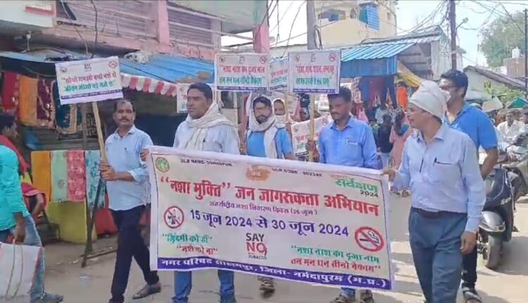 प्रदेश भर में 16 दिवसीय नशा मुक्ति जागरूकता कार्यक्रम दिनांक 15 जून से 30 जून तक चलाया जा रहा है। जिसका उद्देश्य समाज,युवाओं एवं बच्चों को तंबाकू से बने उत्पादों के सेवन से होने वाली गंभीर बीमारियों जैसे कैंसर,टीवी,हृदय,रोग आदि से बचाव करना है। इस उद्देश्य से नगर परिषद सोहागपुर के कर्मचारियों द्वारा जनजागरूकता रैली निकाली गई। वर्ष 2024 के लिए विश्व स्वास्थ्य संगठन की थीम बच्चों को तंबाकू उद्योग के हस्तक्षेप से बचाना है, गौरतलब है कि दिनांक 31 मई को विश्व तंबाकू निषेध दिवस मनाया गया था तथा दिनांक 26 जून को अंतर्राष्ट्रीय नशा निवारण दिवस के उपलक्ष्य में नगर में अलग अलग विभागों के द्वारा विभिन्न गतिविधियों का आयोजन किया जाना है ।