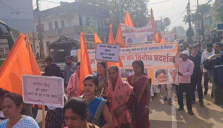 नगर भर के लोगो ने एकजुट होकर कोर्ट चौराहे से रैली निकाली जो पलकमति पुल से श्रीराम चौक , कमानिया गेट , बिहारी चौक , कन्या शाला स्कूल होते हुए रानी लक्ष्मीबाई मंच पहुची। रैली में नगर भर के सैकड़ों सनातनी लोग शामिल हुए, हाथ मे भगवा ध्वज लेकर सेकड़ो की संख्या में लोग हिन्दू विरोधी ताकतों के खिलाफ लामबंद हुए , रानी लक्ष्मीबाई मंच पर एकजुट हुए लोगो ने तहसीलदार राकेश खजूरिया को देश के राष्ट्रपति के नाम ज्ञापन सौपा है, इस दौरान रानी लक्ष्मीबाई मंच पर पंडित कैलाश परसाई, पंडित नीलेश जैन, टेकापार राजुलदेव धाम के भूरेलाल जी कहार,अनिल जैन , सिख समुदाय के ज्ञानी सुरजीत सिंह , हीरालाल गोलानी , इंद्रकुमार दीवान आदि मौजूद रहे।